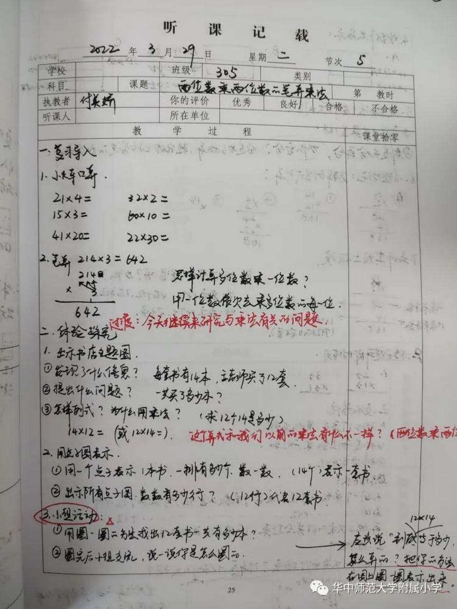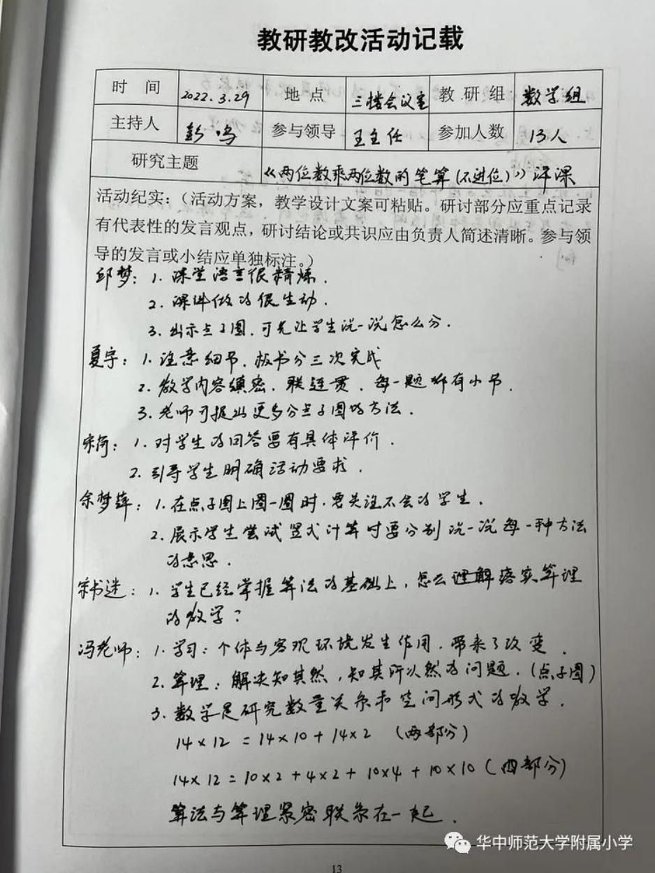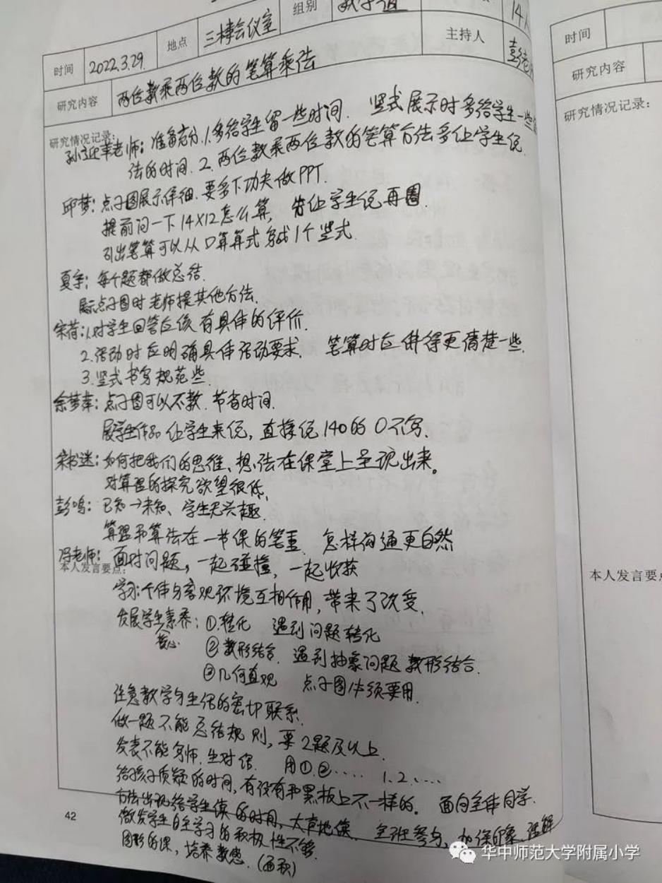 同为三年级组的宋书迷老师,作为整节课的亲历者,他深刻感慨“纸上得来终觉浅,绝知此事要躬行”,付老师受命以来,夙兴夜寐,不辞劳苦,积极探索,还参阅资料,参考论文,深入探究算理与算法的平衡。在将自己的理念融入课堂中时,句句推敲,字字琢磨。为课堂付出了非常多的心血。这节课客观上必然存在一些不足,但对于付老师就是完美的。彭鸣老师作为三年级组组长,总结了整节课设计,备课再到实施的总体情况,也向冯老师以及各位教师表达了三年组的困惑,在学生已经知道算法的课上,如何提升学生学习算理的兴趣,以及在计算课中如何平衡算理与算法。