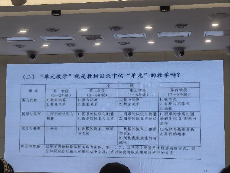 她还列出了早期的大单元观念的内容,分析了“单元教学”"与教材目录中的“单元”的教学的区别,从数与代数、图形与几何、统计与概率等方面都介绍了了大观念所具有的结构、联系和迁移的内涵。