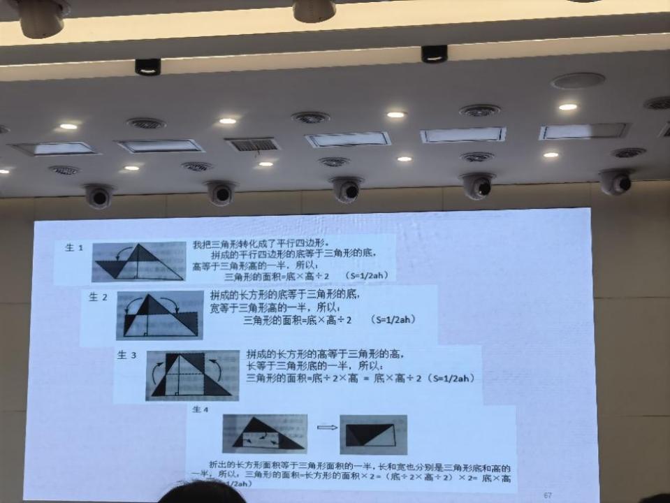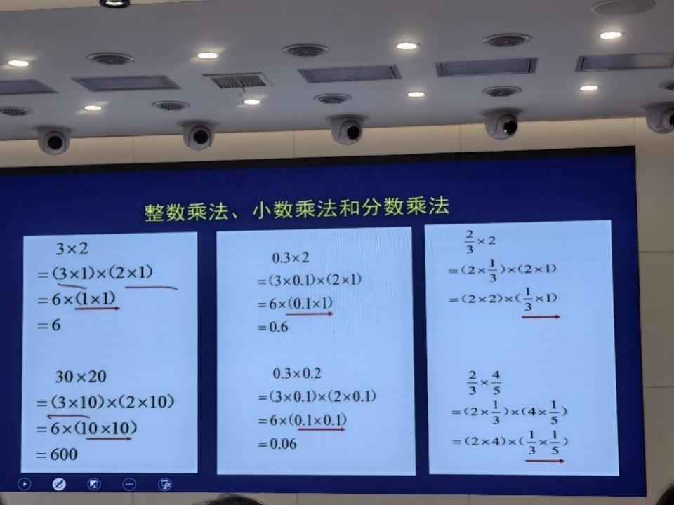 刘老师分享了两个教学案例:从整数四则运算、小数四则运算、分数四则运算之间的区别与联系,到小数和分数之间的转换,将三四五年级相关知识串联起来,脉络清晰,为老师们大单元教学的实践提供了新的视角;通过探究多边形图形面积计算方法间的关系,让大家感受到了数学思想方法中迁移的魅力。