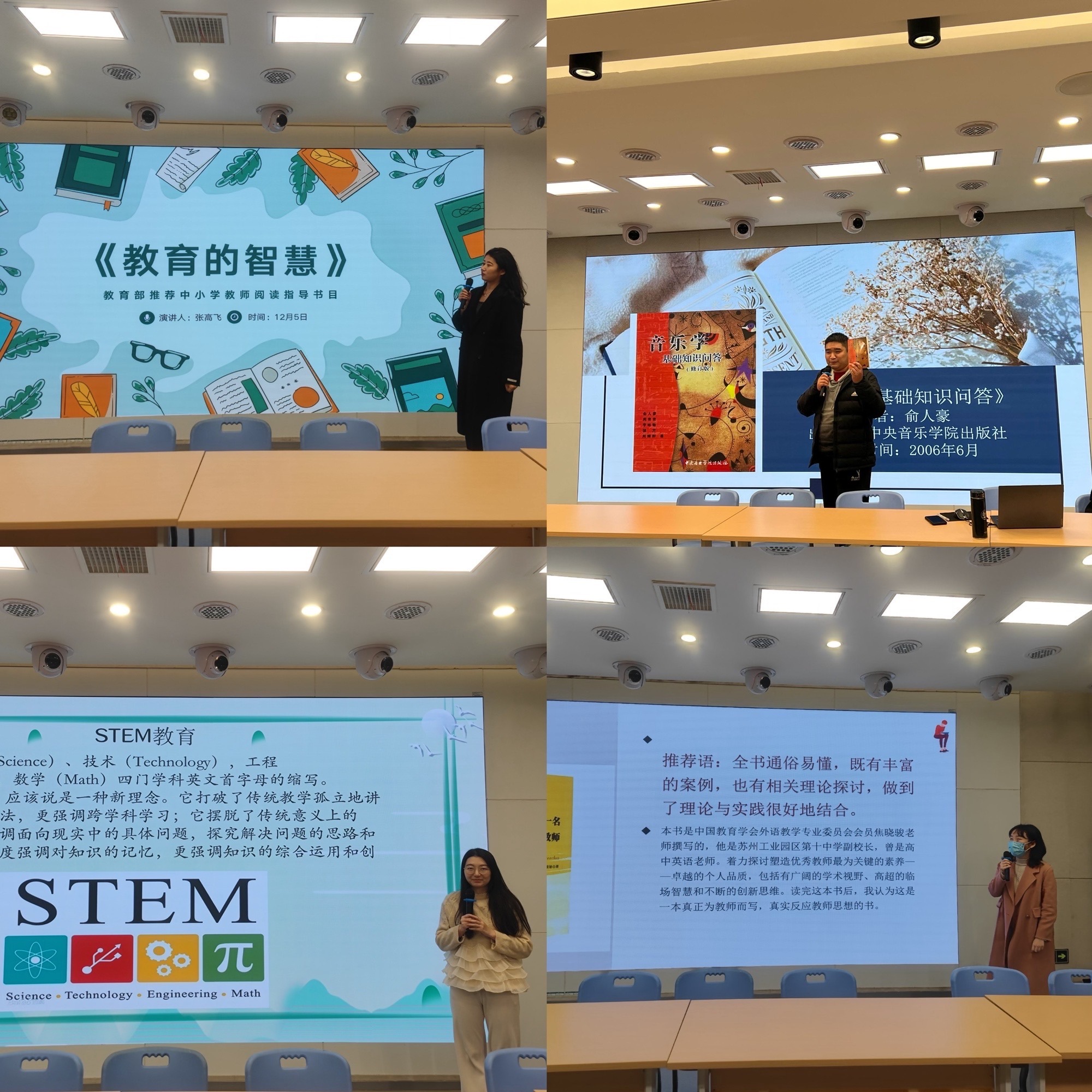其中,余竹青老师提出,要做一个“智慧型”英语教师。蔡依琳教师说到,教师应该积极学习、博览群书,熟悉并熟练运用互联网技术,通过读书学习不断更新知识、拓宽视野,努力地完善自己的知识结构,进而提高综合素质;张高飞老师说到,教师身为教育者,全身心地去爱学生固然重要,但教育的方法不可缺,教育智慧不可少。只有拥有一颗不断探索的心,积极地去寻找教育智慧,才能更有效的教书育人;周越老师为我们分享了《音乐学基础知识问答》这本书,帮助我们认识音乐学,了解音乐学相关知识。廖瑜琳老师分享了一些在实际教育教学中的小技巧,如:使用苏格拉底问答法 ——不要给出答案、给学生进行创造的时间、留一些时间进行反思等诸多实用方法,帮助组教师在实际教育教学中提高工作效率和教学成效。