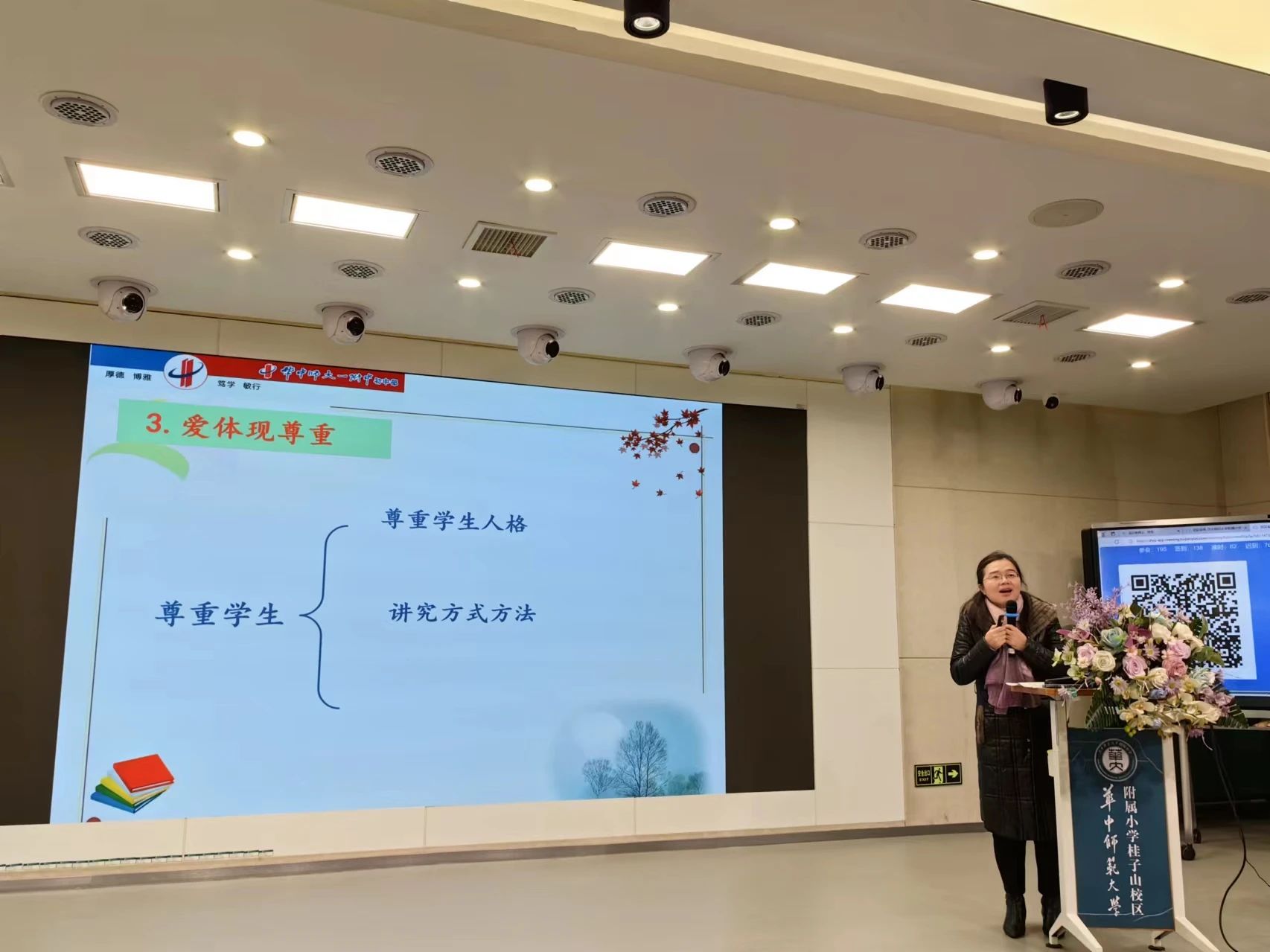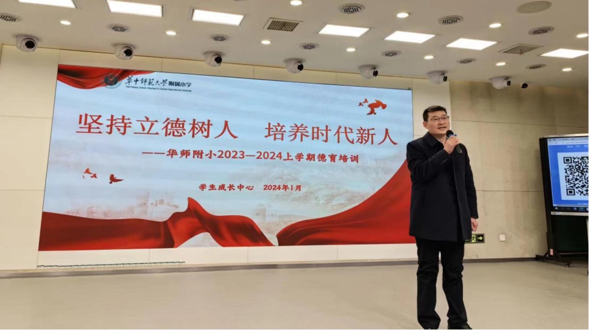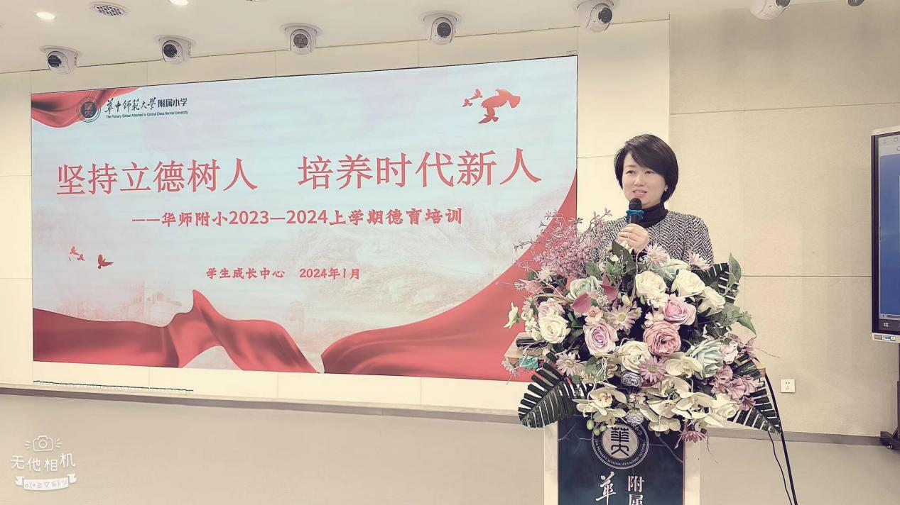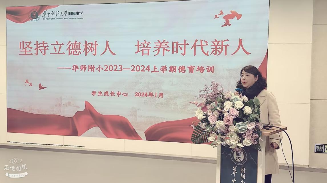 为贯彻落实立德树人根本任务,加强附小德育队伍建设,打造高素质班主任团队,提升班主任专业化水平,进一步探索新形势下班主任队伍建设新途径、新方法,1月25日上午,华师附小举行2023-2024上学期一校两区德育专题培训。活动由桂子山校区学生成长中心曹兰主任主持。