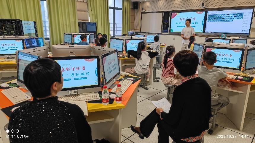 展示进入课堂教学展示环节,从相淼老师执教的课题是《隐形守护者——初识二进制编码》,上课时间是13日上午第三节课。在课堂上,从相淼老师创设有趣的故事情境,和孩子们一起畅游了“计算机的内部世界”,引导学生在探索中完成任务。从相淼老师专门设计开发的程序既体现了教师的专业水平,也更好的帮助学生融入课堂,参与课堂。整堂课富有感染力,学生小组内分工明确,小组之间合作交流密切,学生参与度高,切实培养和提升了学生的数字素养。