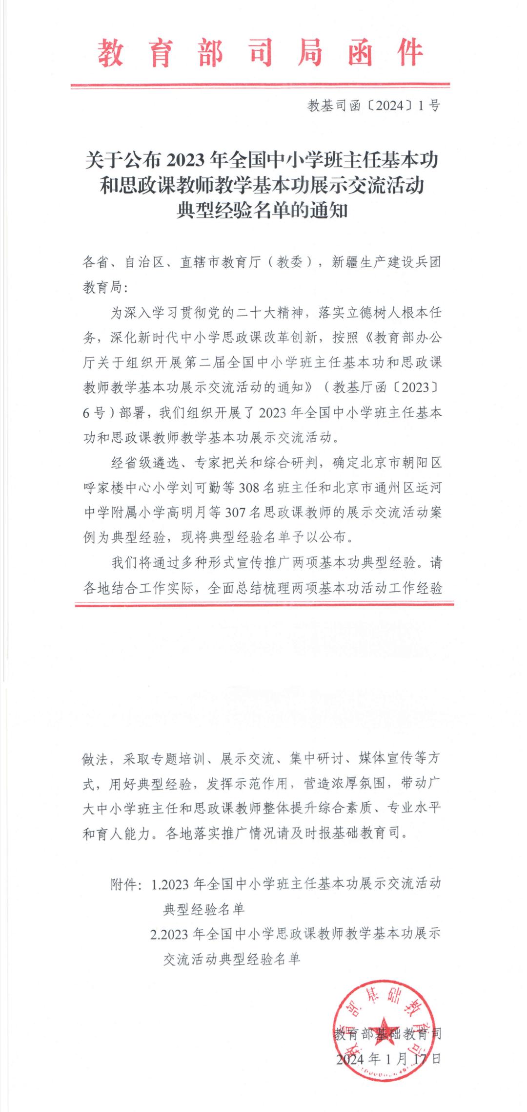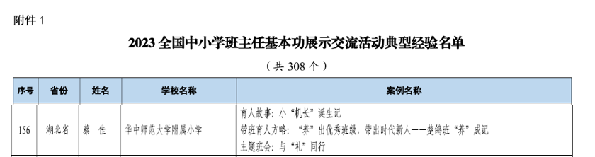 近日,教育部公布2023年全国中小学班主任基本功展示交流活动典型经验名单,华师附小蔡佳老师入选荣获全国典型经验。