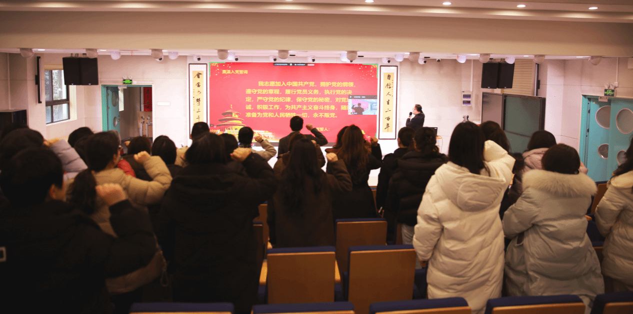 活动伊始,全体党员起立奏唱国歌,激昂的旋律在阶梯教室中回荡,进一步强化了党员教师的政治认同和使命担当。随后,在支部书记唐从义的带领下,全体党员面向党旗庄严举拳,重温入党誓词。“我志愿加入中国共产党……”铿锵有力的誓言声声入耳、句句入心,既是对初心使命的坚定回顾,也是对教育事业的庄严承诺,使全体党员在党性锤炼中接受了深刻的精神洗礼。