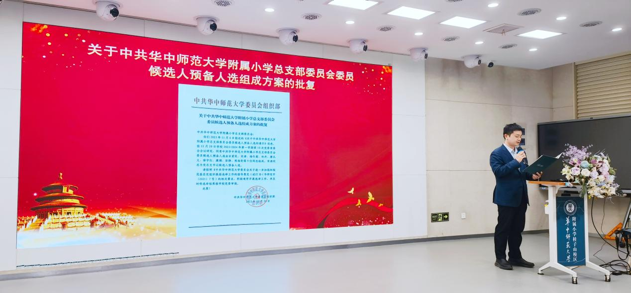 华中师范大学党委组织部常务副部长兼党校常务副校长龚炜同志宣读了校党委关于中共华中师范大学附属小学总支部委员会委员候选人预备人选组成方案的批复。经由校党委常委会会议研究,同意中共华中师范大学附属小学总支部委员会新一届委员会委员候选人预备人选名单。