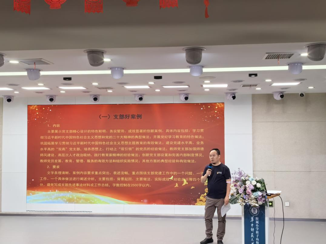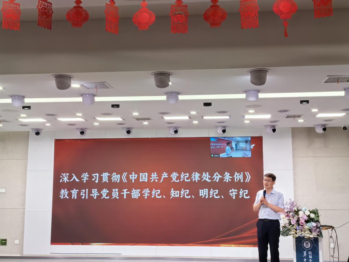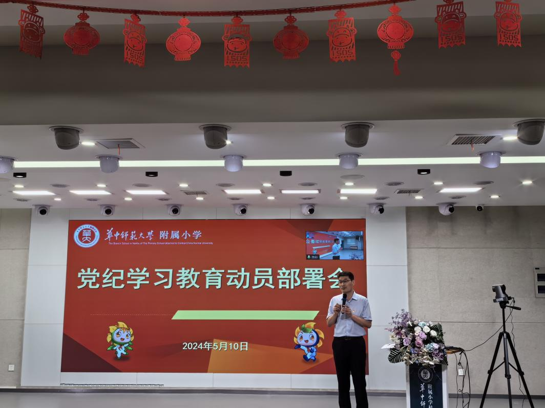 根据湖北省委组织部、湖北省委教育工委工作要求,按照校党委关于开展党纪学习教育的实施方案,华师附小党总支于2024年5月10日下午在阶梯教室召开了一校两区全体教师党纪学习教育动员部署会暨5月主题党日活动。华师附小党总支书记宋涛讲党课,对全体教职工和党员开展党纪学习教育专题培训,活动由党总支委员、桂子山校区教工党支部书记唐从义主持。