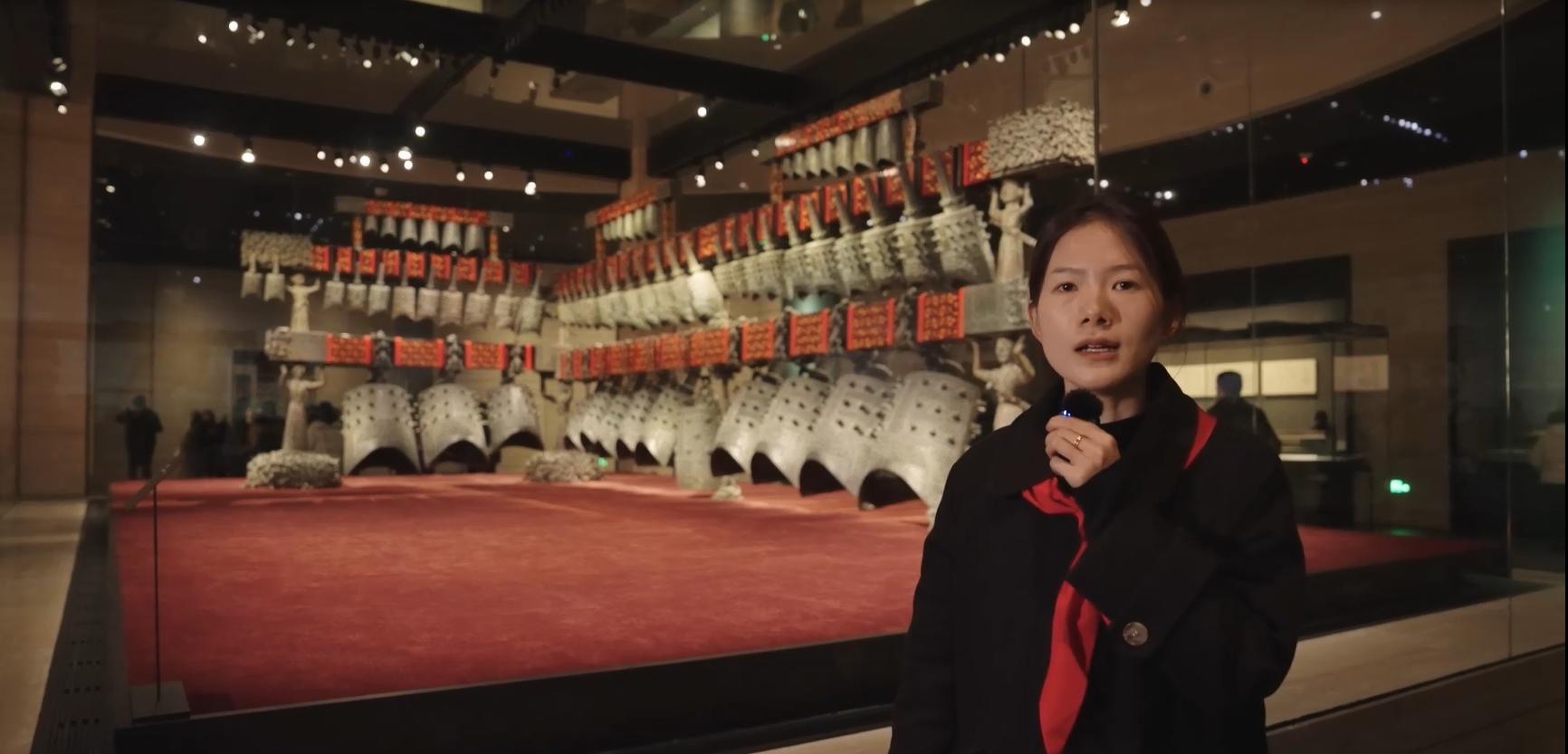 曾侯乙编钟(镈钟)是一件乐器,分为上中下三层(分别为钮钟、南钟、甬钟),共65件。中间一件垂直悬挂是楚王镈钟,是楚惠王为感谢曾国曾对他父亲楚昭王的帮助送给曾侯乙的。除这件镈钟不发音,其余钟均能演奏一钟双音。以此展品祝愿队员们双龙贺喜,福气满满。