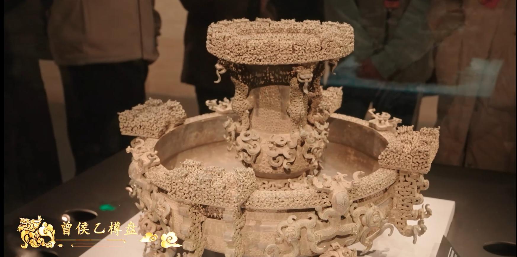曾侯乙尊盘是春秋战国时期的作品,这是一套酒器、礼器,里面部分为尊,是用来存放酒的器具,外面部分为盘,是用来放水的器皿。冬天放上热水可以温酒,夏天放上冰块可以冰镇。尊和盘合为一套,尊盘共有纹龙84条龙,蟠螭80条,四方和圆的交汇是一种蛇,造型复杂,镂空设计采用的是失蜡法制作,现代技术无法复制。以此展品祝愿队员们龙马精神,祥瑞满堂。