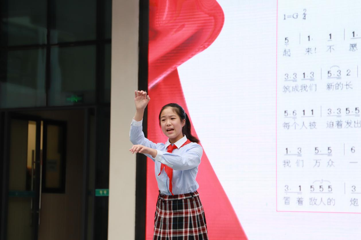 接下来,在大队委王子怡的指挥下,附小全体学生和在场的大学生齐唱国歌,庄严的歌声响彻校园,现场神圣而肃穆。这一刻,在场的师生都热血沸腾,点燃了师生的爱国爱国情怀。