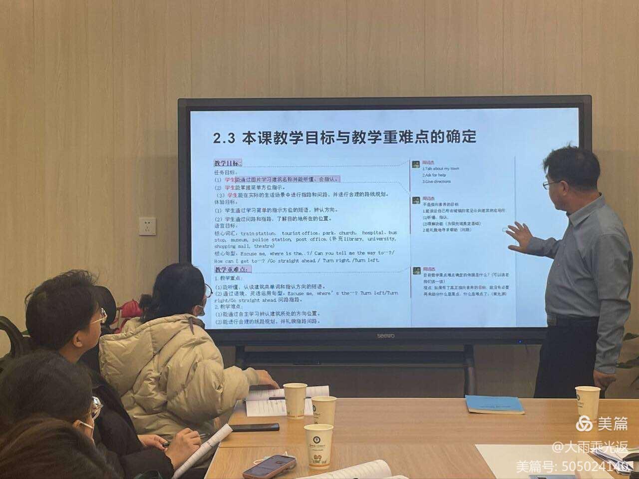 周老师细致分析、点评了雷老师的教学设计,从教学目标、教学重难点、到教学过程一一指导完善。周老师强调,课堂教学需重视培养学生的思维品格,引导学生在真实的情境中完成任务,习得语言,学会应用。周老师指出本节课,还可以从梳理中外公共建筑物,礼貌问路,向他人寻求帮助或提供帮助等方面设定目标。在场老师们收获颇丰。老师们积极交流提问,周老师一一回复指导。