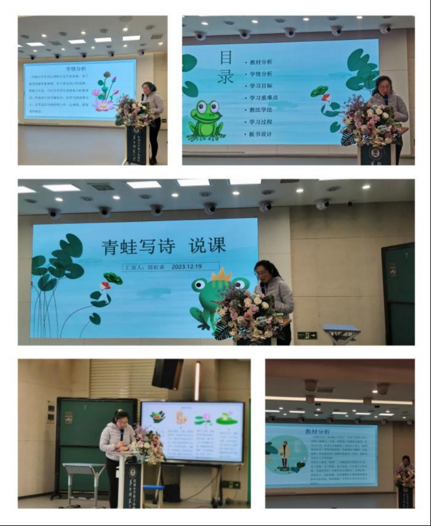 课后,陈虹希老师就执教的课文进行说课,从“教材分析、学情分析、学习目标、学习重难点、教法学法、学习过程、板书设计、自我反思”等方面全面展开阐述,感谢教研团队给与的爱和帮助,感谢听课教师们的包容和鼓励。