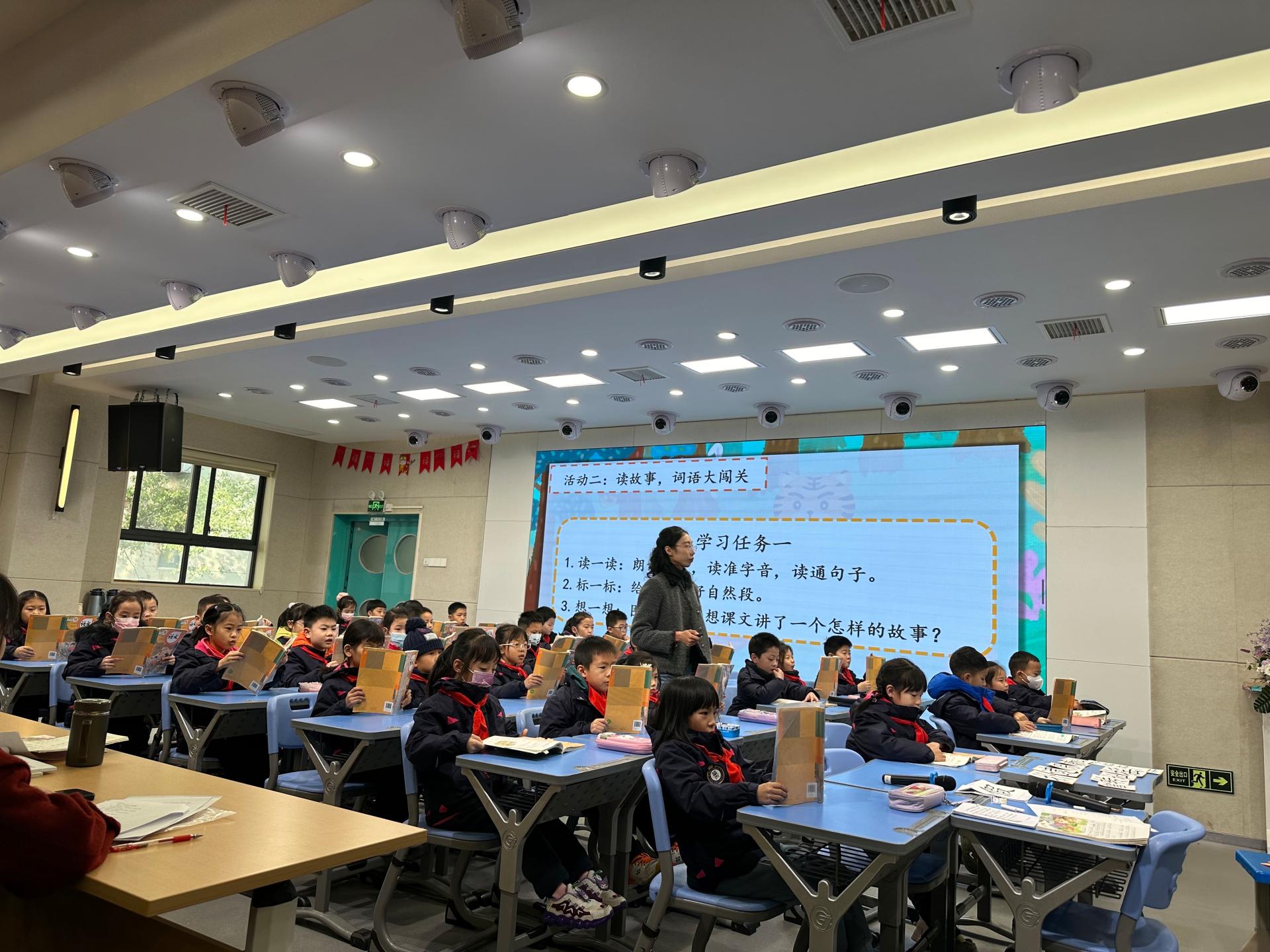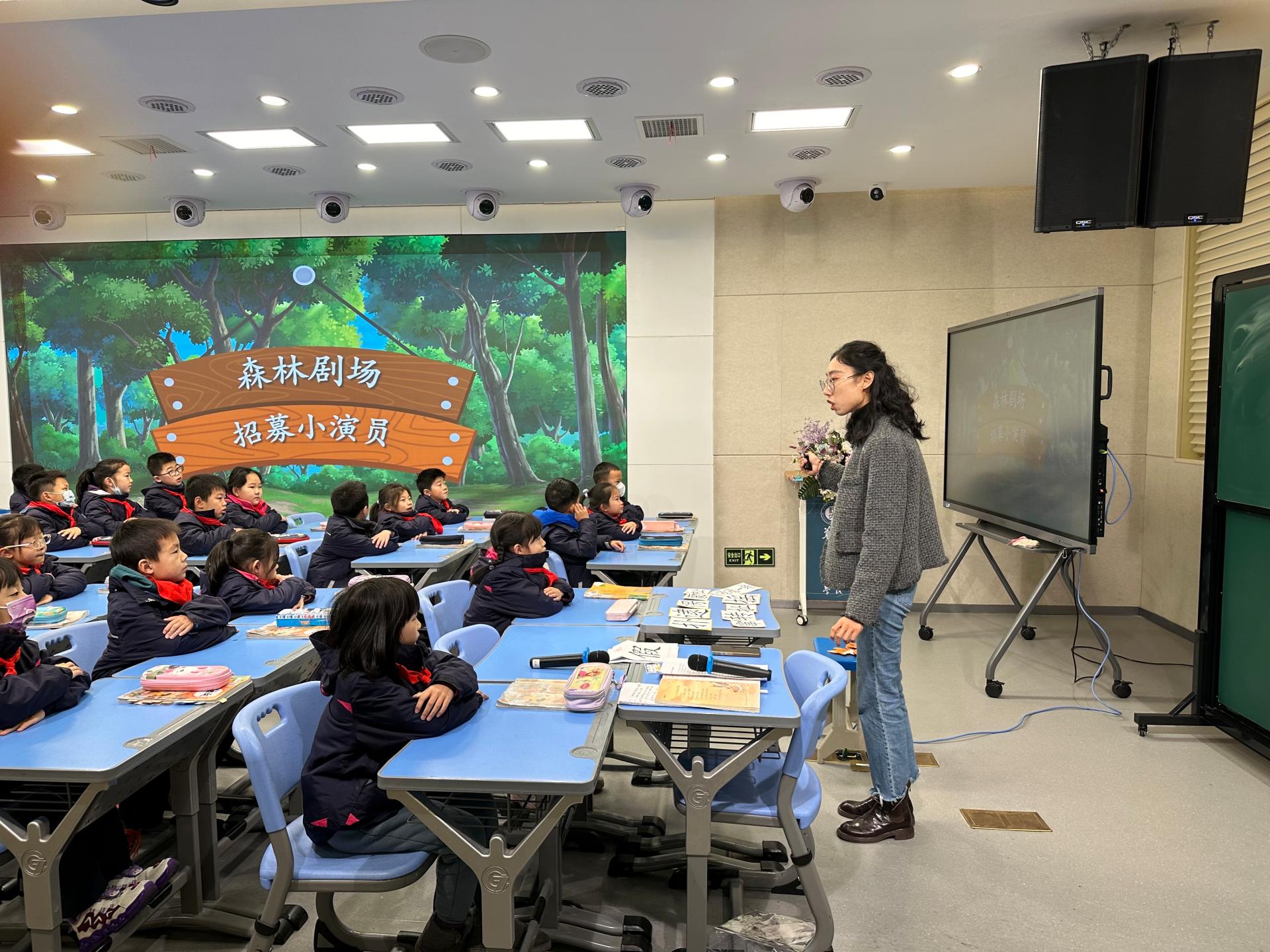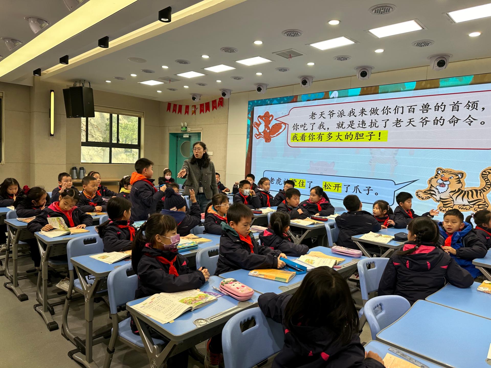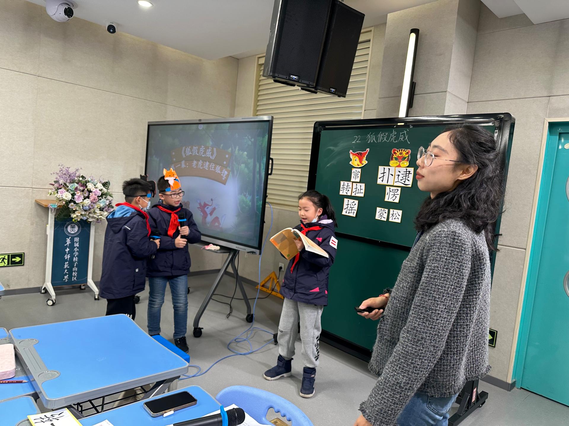 首先,由我校青年教师杨筱奕带来统编版二年级上册阅读课例《狐假虎威》。杨老师根据新课标精神,创设了“童话故事馆”的真实情境,激发学生积极参加语文实践活动的愿望。本课根据年段特点,围绕本课中狐狸和老虎的动物,抓住文本中的关键语句,层层深入地引导学生体会语言,感受动物的内心世界,读出句子的语气。杨老师还善于构建真实的活动场景,利用小动物的头饰,调动孩子们的表演兴趣,让孩子们爱上朗读。整节课妙趣横生、热闹非凡,以学生为主体,满足了学生的发展需求。