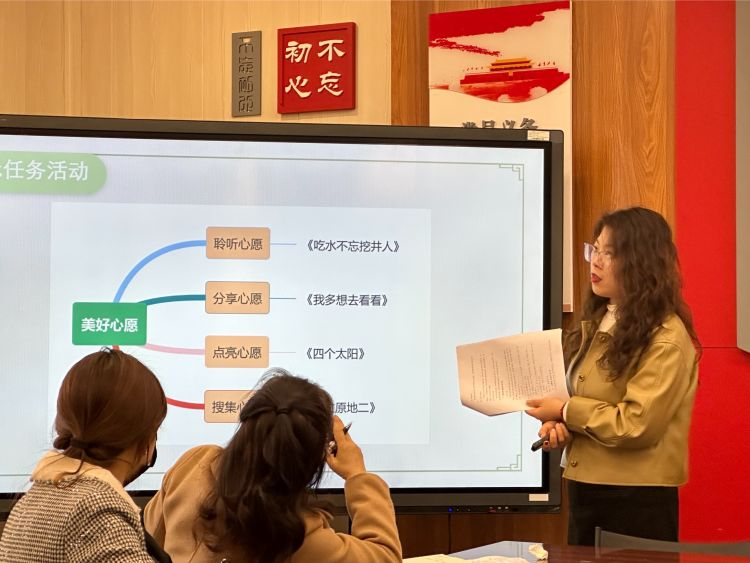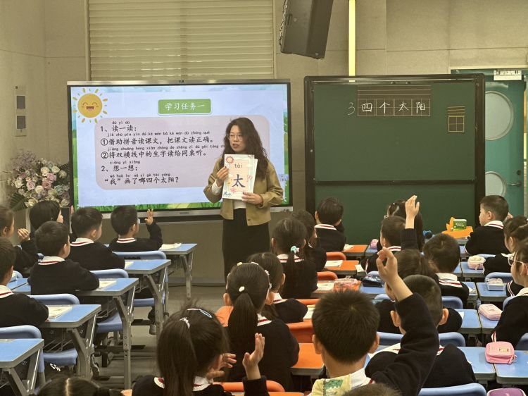 王颖老师倾情授课,引导101班全体同学走进《四个太阳》的精彩世界。她以极富感染力语言,创设真实有效的课堂情境,巧妙点拨,“聆听心愿——分享心愿——表达心愿”,课堂生成高潮迭起,层层引导,叩开童心之门,拔动学生心弦,奏出师生共鸣的绝美乐章。短短四十分钟也让在座听课老师近距离感受学习任务群视域下的单元整组语文教学的魅力。