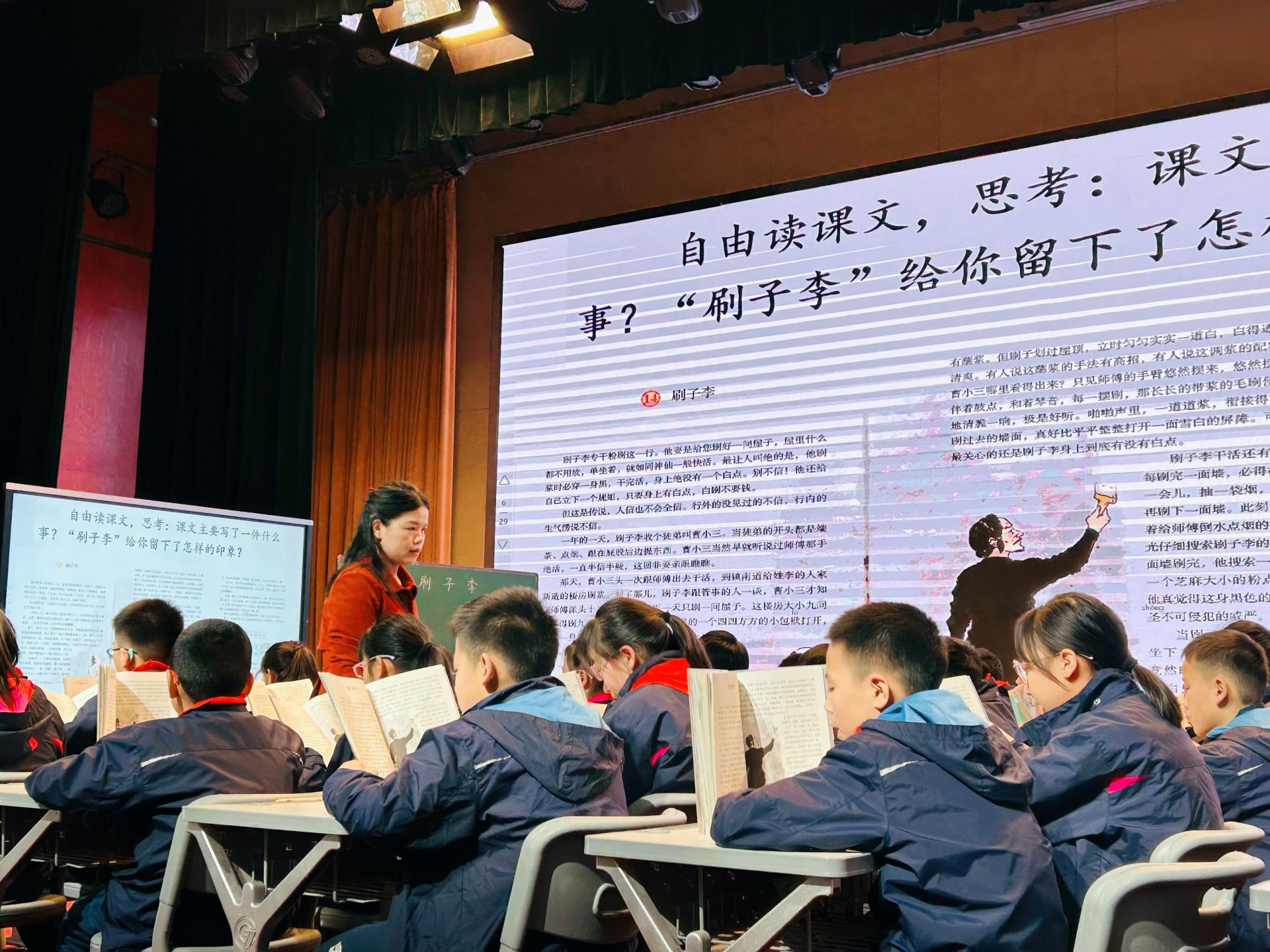 南湖校区阮娜老师为大家带来了阅读展示课《刷子李》。阮老师以走进名家笔下的人物长廊开课,接着让孩子们自主介绍对作者冯骥才的了解,顺势引出冯骥才的名篇《俗世奇人》。授课过程中,阮老师紧扣“奇”字,围绕“穿着奇、动作奇、效果奇”,带领学生走进奇人——刷子李,从正面去感受刷子李这个人物的特点。阮老师特别注重引导学生读中感悟,引导学生抓住关键词,读出自己对人物的理解和感受;在初识奇人、走进奇人后,巧妙运用比较阅读的方式,探究文章的表达方法。整堂课充分尊重学生的情感体验,将提升学生的语文核心素养落到实处。