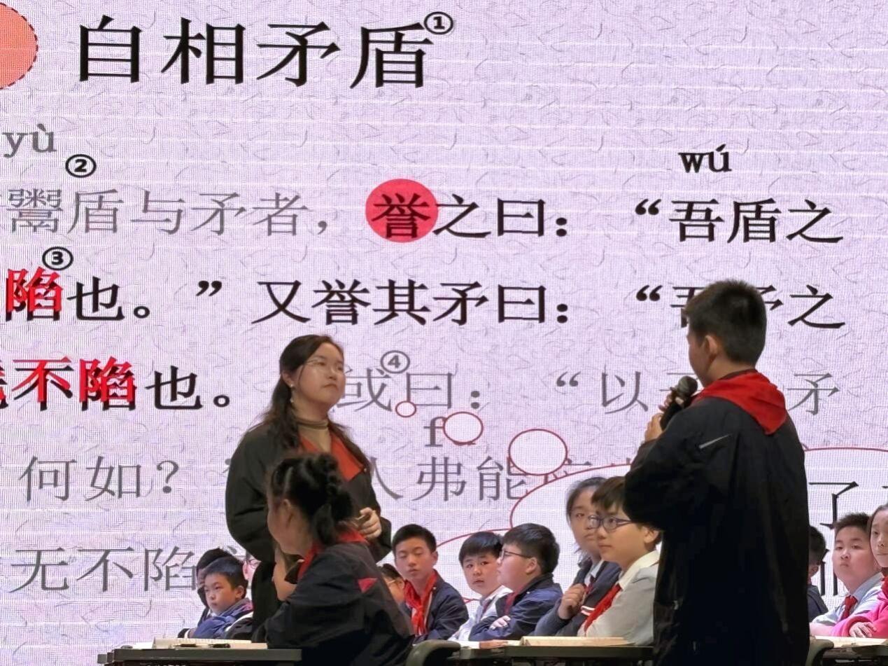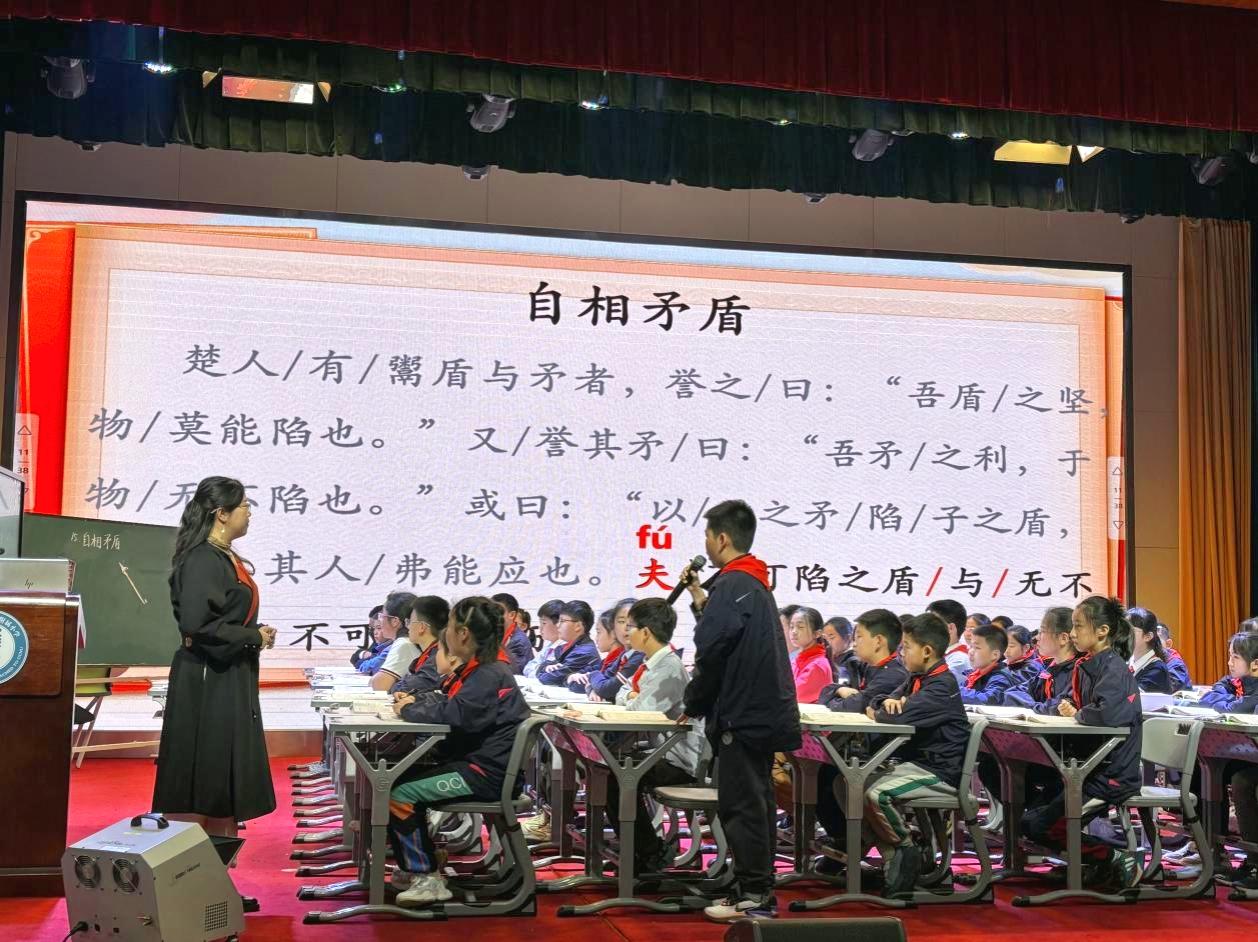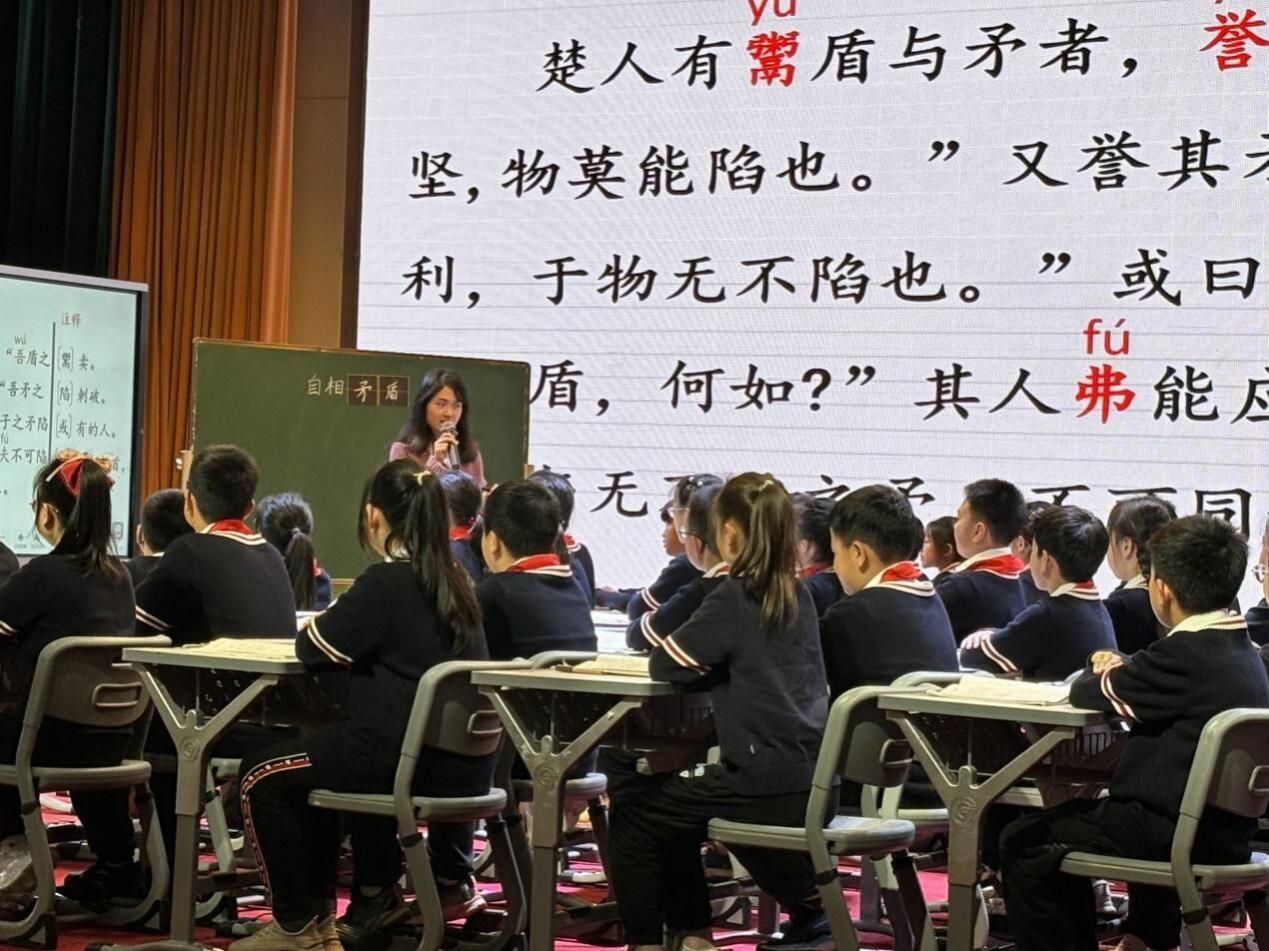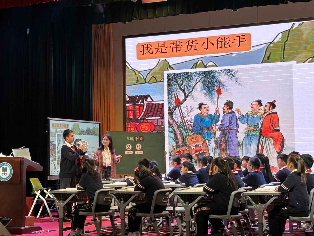 本次活动的主题为“同课异构”,选取的课文是五年级下册第六单元第14课《自相矛盾》,华师附属理想城小学的明楠楠老师和我校米歌老师为观课教师呈现了两节精彩的课堂展示。